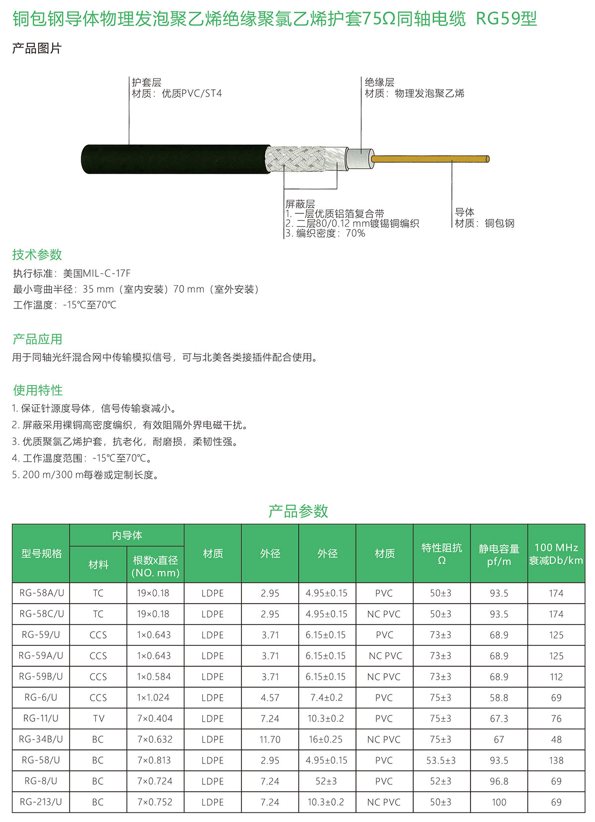 > 铜包钢导体物理发泡聚乙烯绝缘聚氯乙烯护套75Ω同轴电缆RG59型